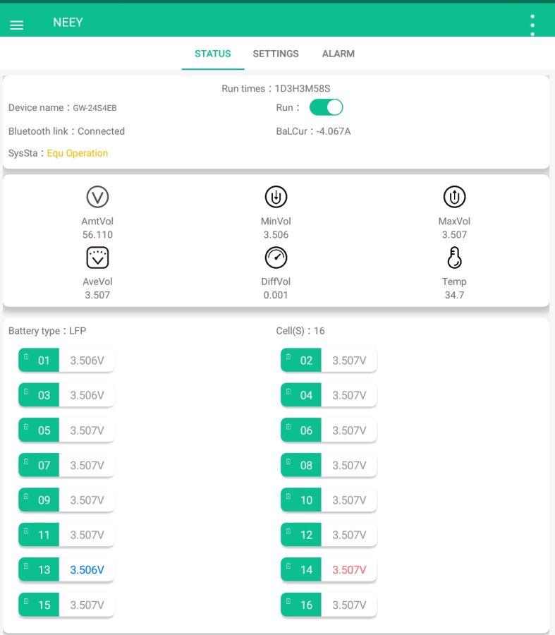 Nach knapp 2Tagen ist mein Speicher absolut ausgeglichen. Die Kombination aus Aktiv Balancer mit einstellbarer Balancer Startspannung macht nun ein Topbalancing wirklich schnell und zuverlässig möglich. Ich kann den wirklich empfehlen. Ich hatte vorher den aktiven 5A Heltec, der über den ganzen Spannungsbereich balanced hat. Ein Topbalancing war da nicht möglich, die Zellen waren unter 3,4 immer nah beeinander aber oberhalb immer weit auseinander 0.15-0.2V.