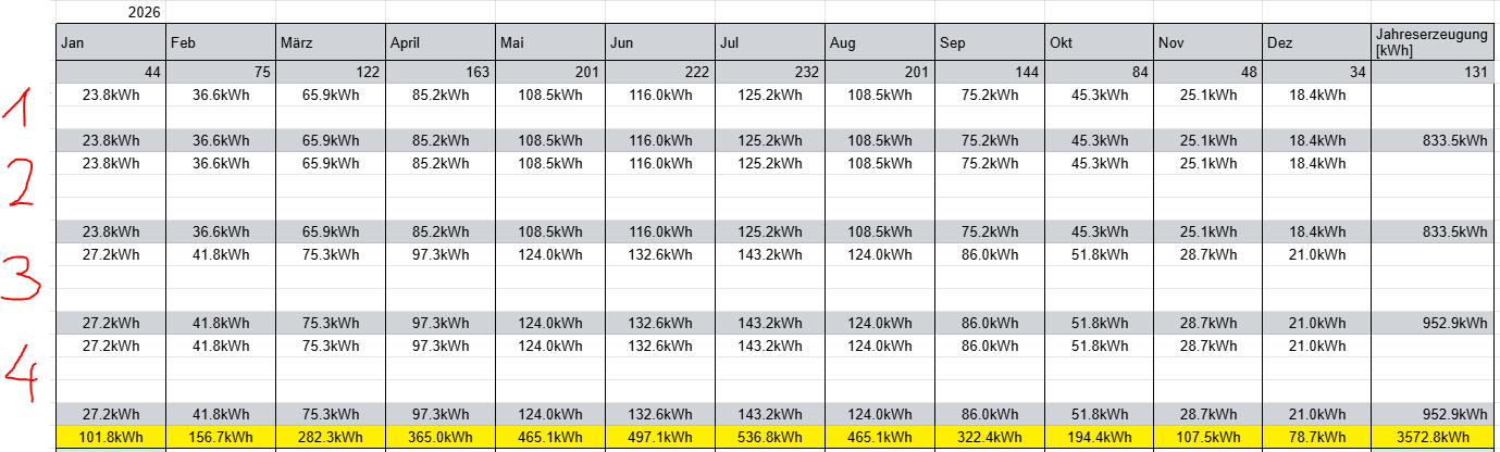 bei Anschluss 3&4 habe ich je noch ein drittes Modul mit 410Wp angeschlossen…. Untenstehend siehst Du die Mehrleistung gegenüber 1&2 vom Dezember 2025.