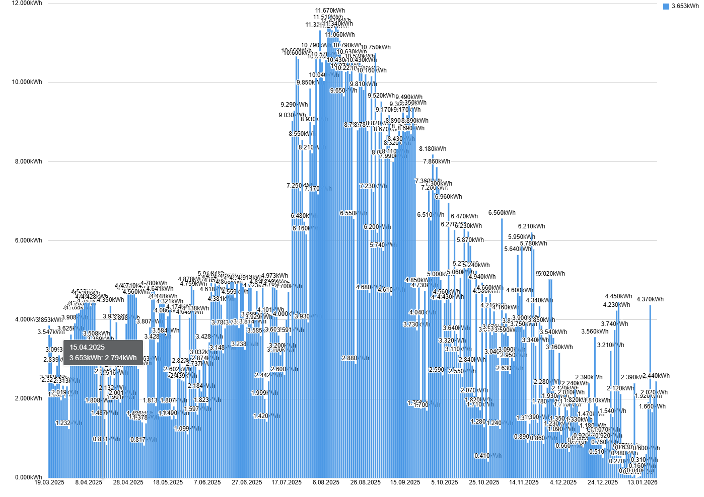 Hatte 23kWh anschliessend WP-Boiler für BWW neu 18kWh ab März 25 einen durchschnittlicher Tagesverbrauch von ca.18kWh ohne PV Ertrag. Mit aktueller PV siehe Tabelle.