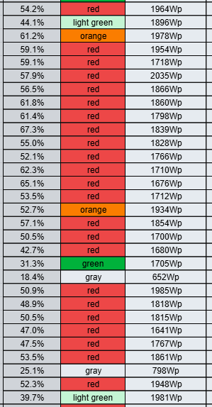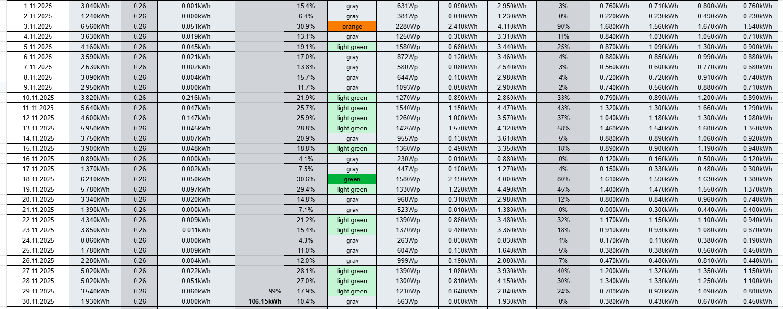 Hier der November Ohne Schnee, da hatte ich 99% der errechneten Leistung. Spalte 2.Tagesertrag. 4.Überschuss 6.Autarkiegrad 7.Akkunutzung 8.Tagespeak 9.Akku 10.Direktverbrauch 12-15. Modulerträge.