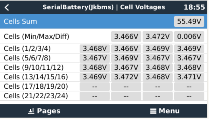 Sein Akku war ja nicht auf 61,6 Volt, sondern der Multiplus hat 61,6 Volt gemessen. Das JK-BMS hat aktuell ja gar keine Anbindung an VenusOS.