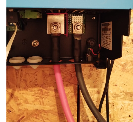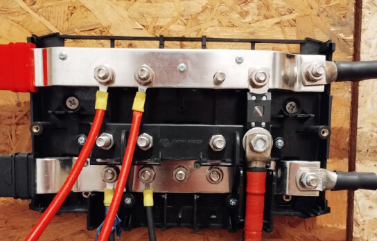Hier der Lynx die Kabel von den MPPTs sind die linken - derzeit noch etwas zu lang, da ich einen 2. Lynx bekomme, der links daneben kommt. Ganz rechts (an den eigentlichen Verbindern) die beiden Kabel gehen zum MP , die übrigen beiden an den AKKU.