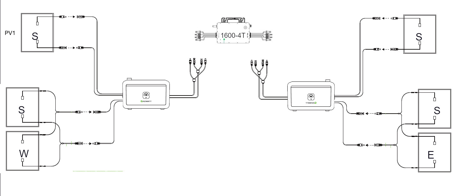 Gibt es einen Grund warum Du in Deinem Schema ein West- und ein Süd-Modul parallel schaltest? Ich würde beim linken Noah die Süd-Module parallel schalten und das West-Modul einzeln. Und beim rechten Noah genauso Süd-Module parallel und das Ost-Modul separat.