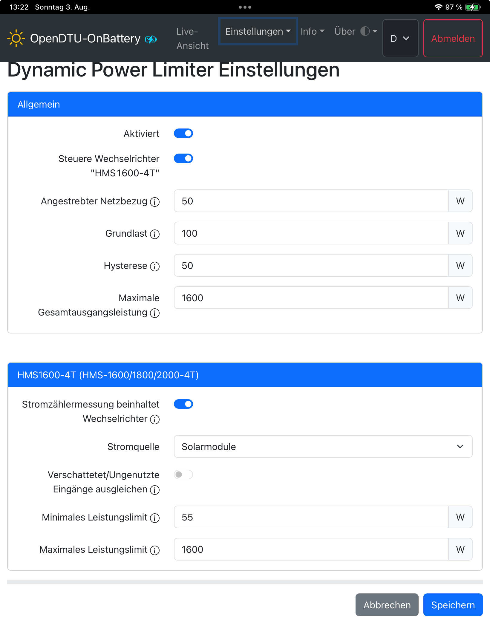 Genauso wie die generellen Einstellungen bezüglich der Nutzung. Ich habe nicht den Anspruch an so eine „kleine“ Anlage, jede Spitze abzufangen. Bei mir steht die Grundlast im Vordergrund. Rein abrechnungstechnisch ist es völlig egal, ob ich jede Spitze anfange und die Akkus schnell alle sind oder ob ich die Grundlast bediene und sie halten länger. Wenn alle - dann alle