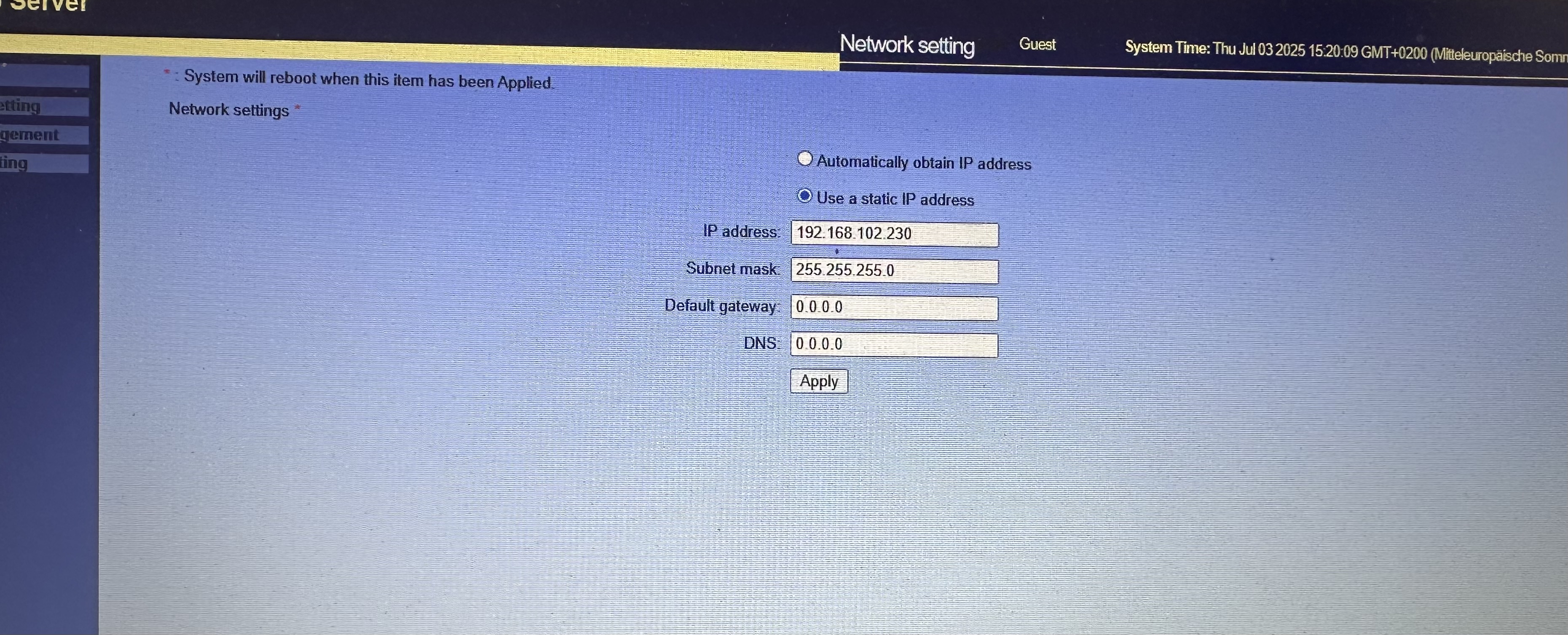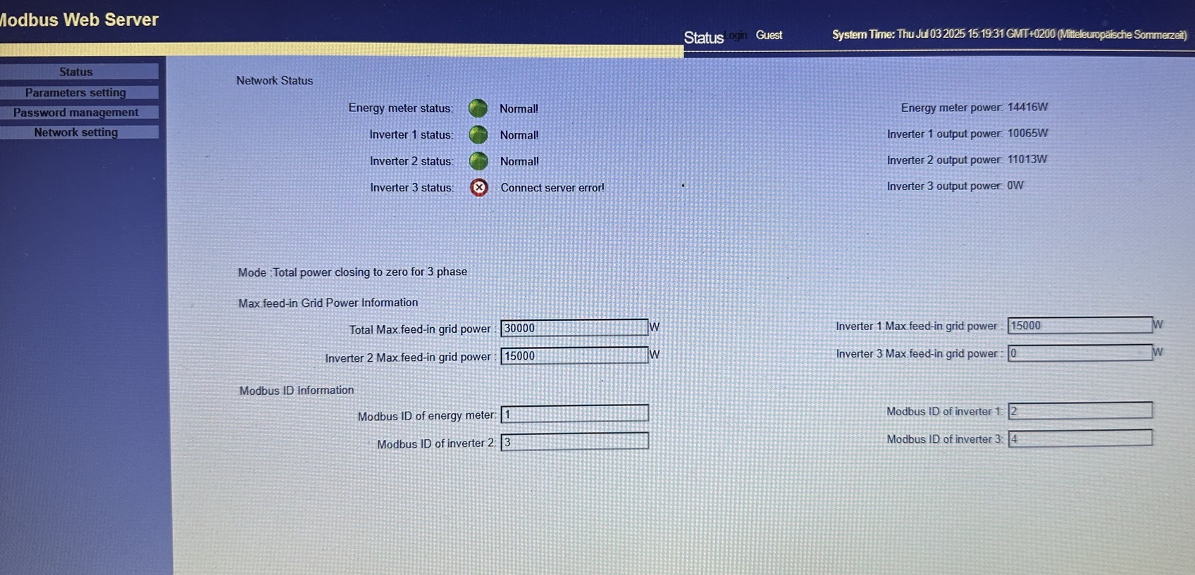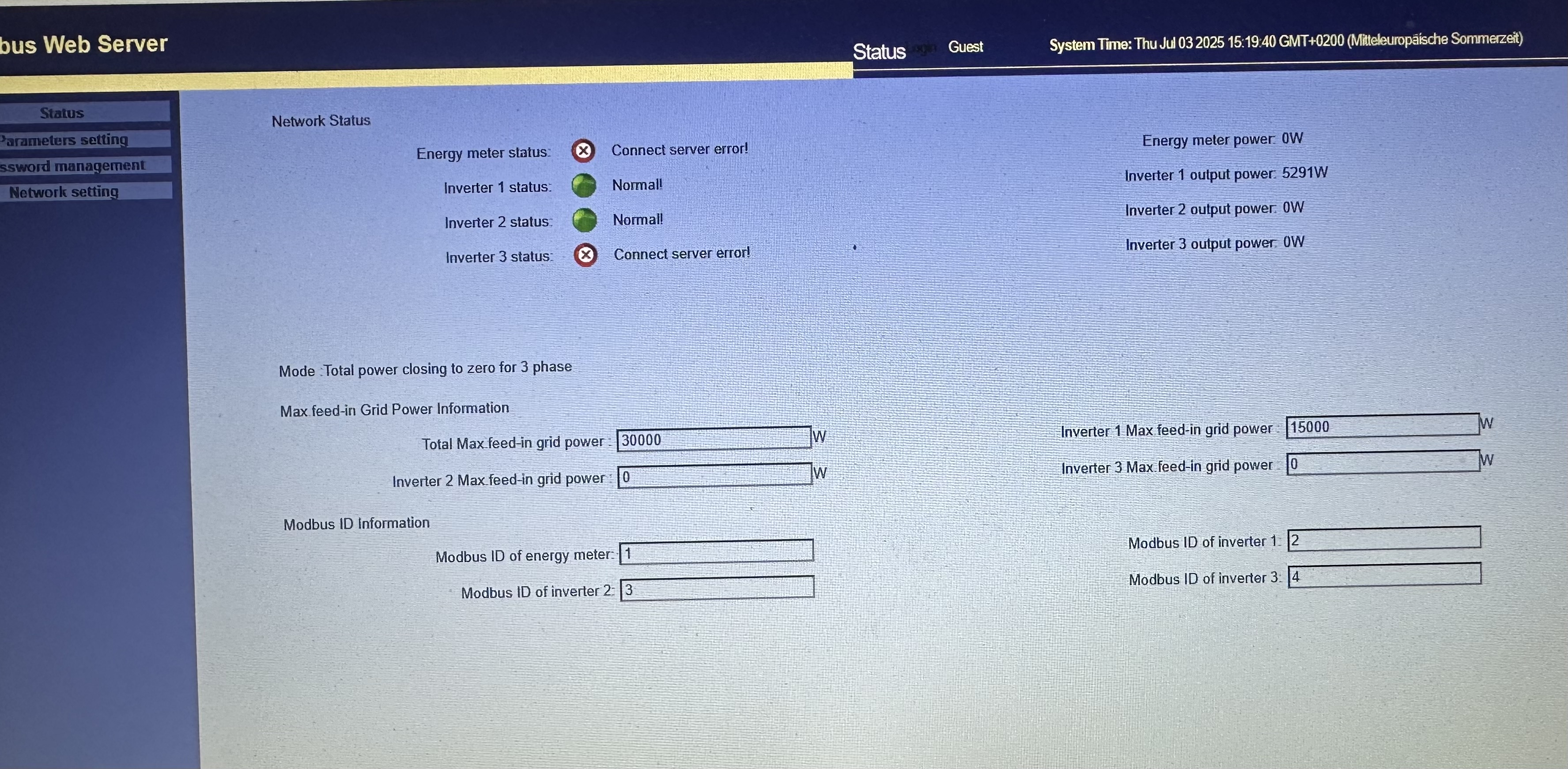 Hier sind die Screenshots von der Webserveroberfläche. Die meiste Zeit ist der Status: Energy Meter : Connect Server Error. Als ich eben den Webserver einmal aus und wieder angestöpselt habe, war kurz alles grün.