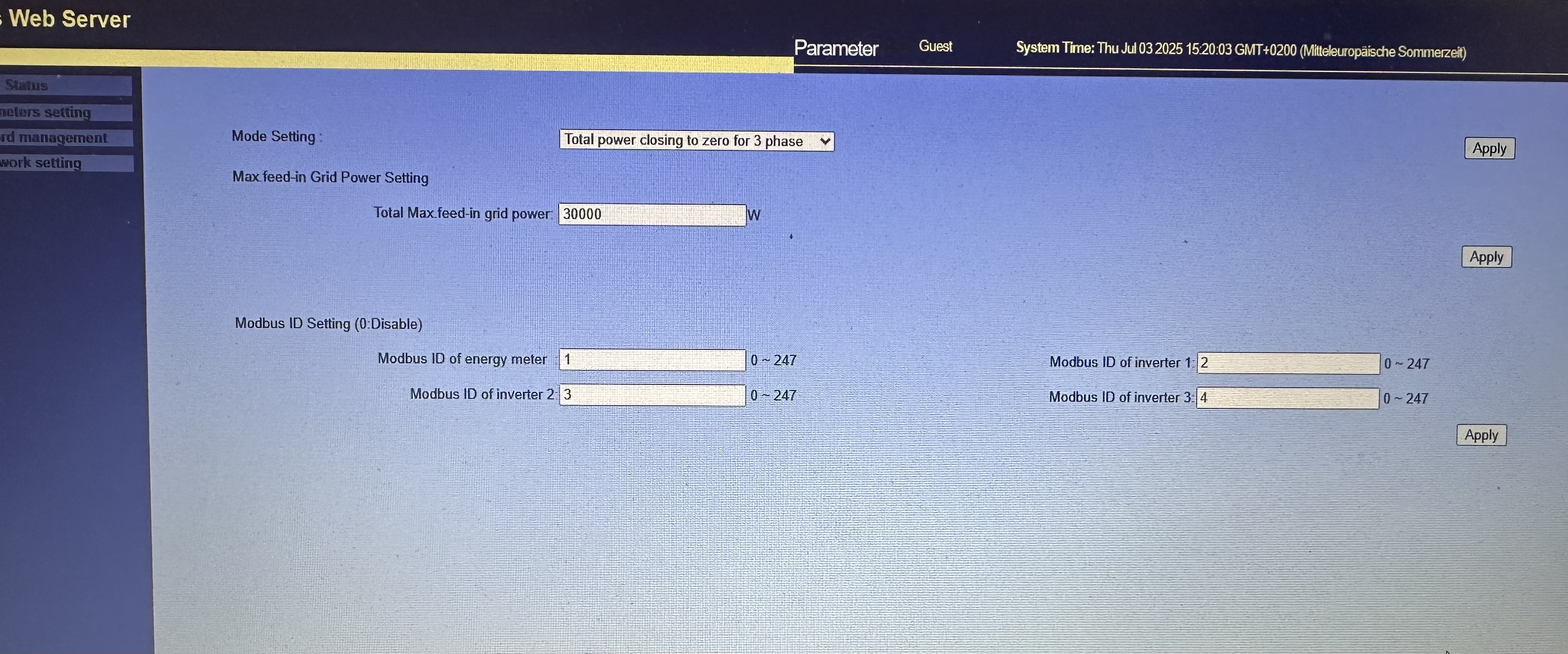 Eine Frage noch: Wie läuft bei dir die Stromabrechnung vom EVU? Soll der Zähler saldierend arbeiten oder jede Phase ausgleichen? Das musst du nämlich am ModbusSRV einstellen (Mode Setting), im Display des WR steht dann EC-ON1 oder EC-ON2, je nach Einstellung.