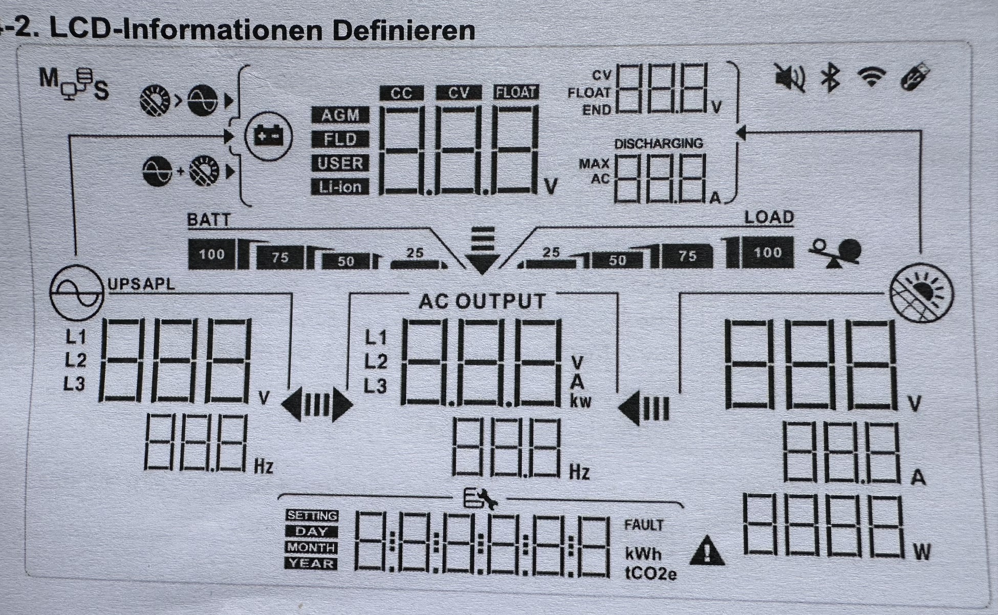 Das BMS hat wohl ein LIB Protokoll. Das kann man auch einstellen. Wenn ich das mache, erscheint im Bildschirm ein "LI-ION" Icon. Aber die Werte für Ladung und Betrieb verändern sich drastisch. Die habe ich dann manuell auf "meine" Werte gesetzt aber nach kurzer Zeit wurde sie wieder mit den drastischen Werten überschrieben. Jetzt habe ich es wieder auf USE stehen, aber dann ist das LI-ION Icon weg, was laut Anleitung dafür steht, dass WR und Batterie richtig kommunizieren.