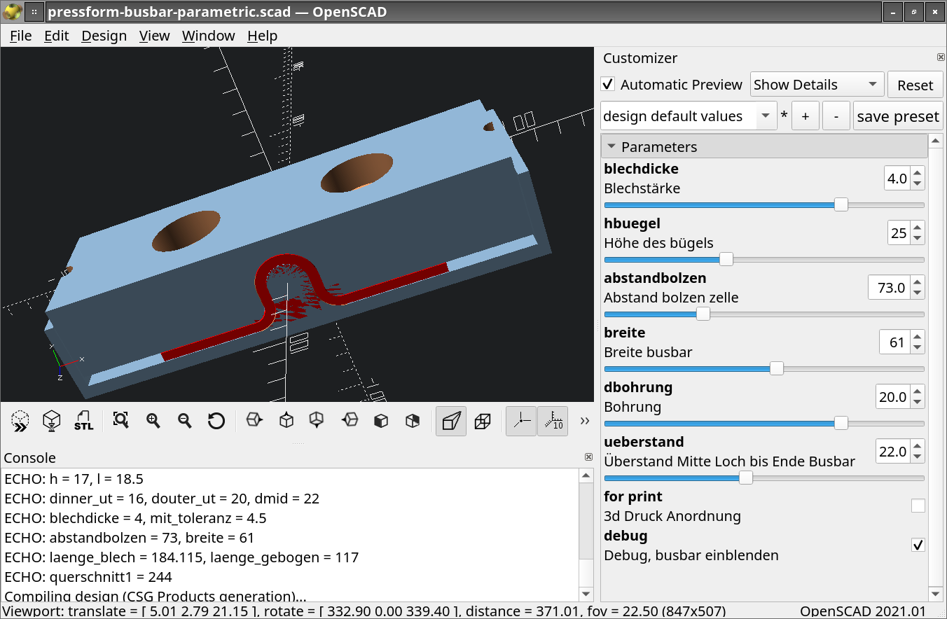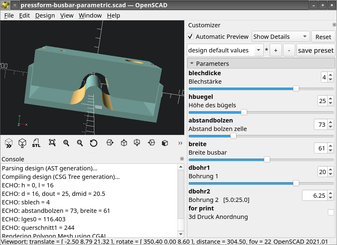 Das 3d modell wurde mit OpenScad erstellt. Es ist parametisierbar, d.h. länge, breite,