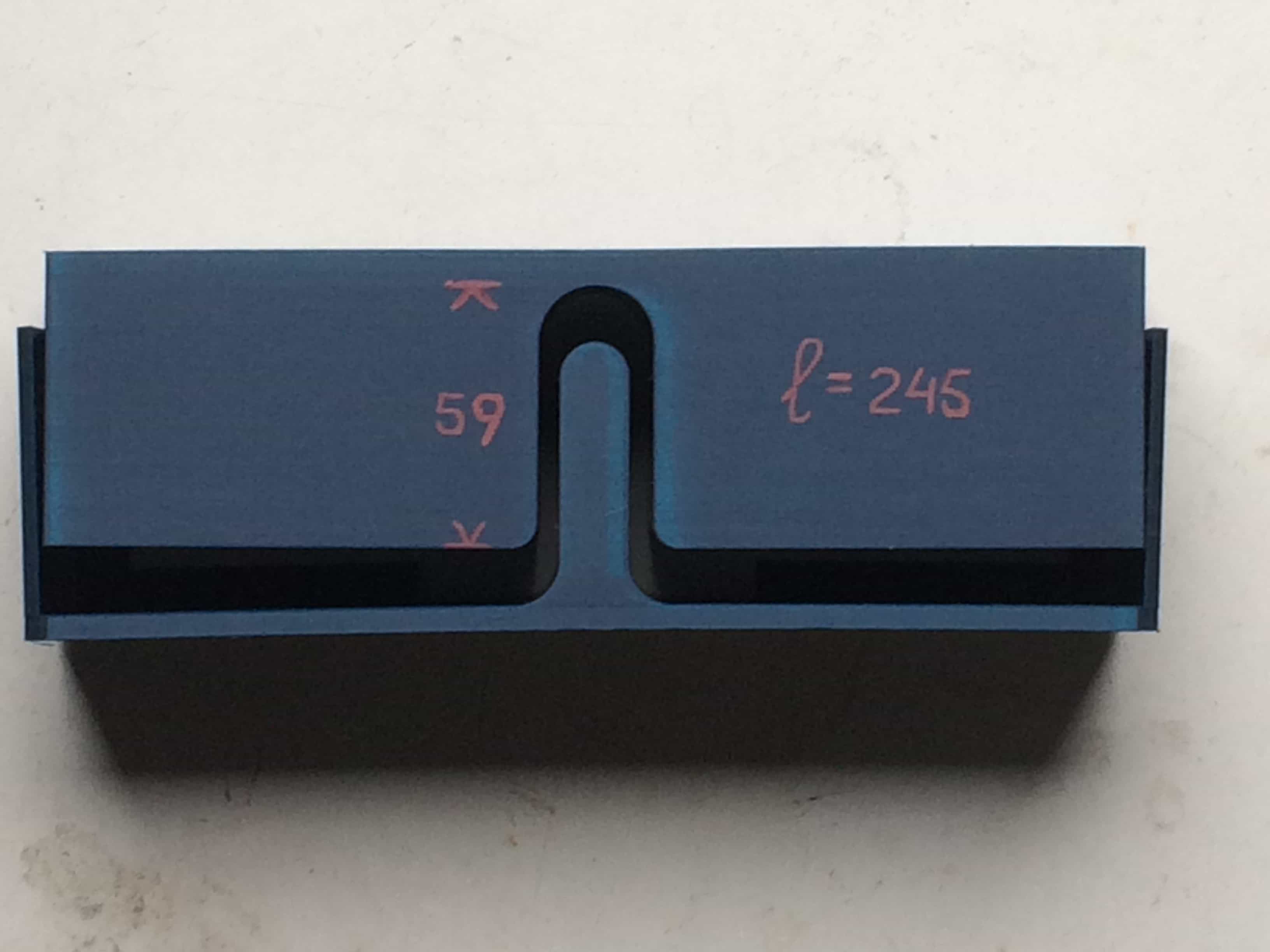 Mit Bügelhöhe 25 mm war das Ergebnis für mich zu starr/steif. Danach habe ich noch ein neuer Pressform gedruckt. 3D-Druckbett ist begrenzt auf 220 mm. Deswegen Bügelhöhe 47 mm statt 50 mm. Mit Bügelhöhe 47 mm ist für mich das Ergebnis brauchbar mit das 4×1×60 mm¹ 1050-W7 Aluminium.