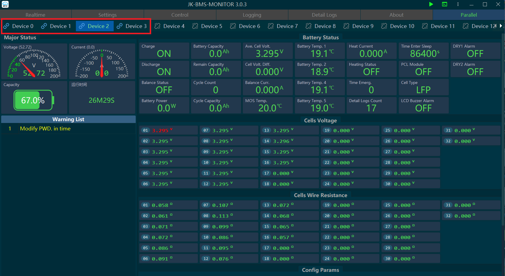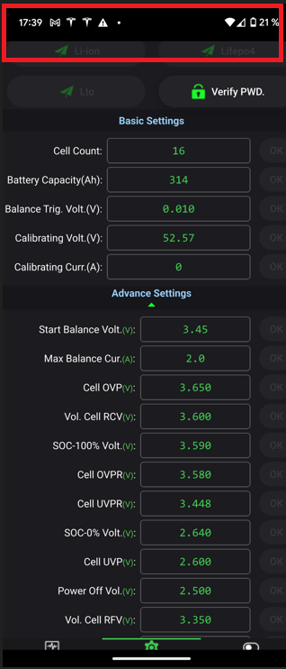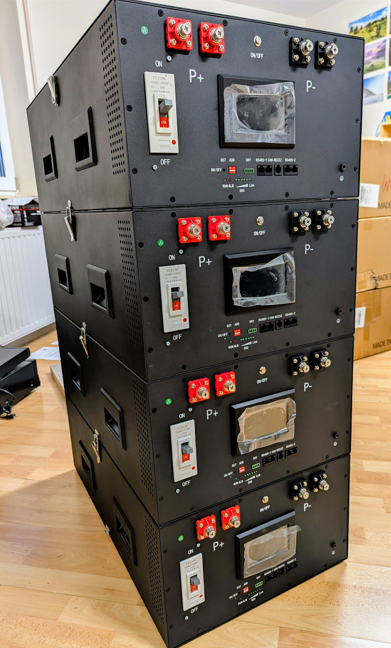 Der Batterieturm steht inzwischen auf dem DIY-Untergestell und am finalem Platz. Habe heute die Zeit genutzt und die Konfiguration der Batteriemanagementsysteme der Boxen beendet. Dafür habe ich die Werte von Andy übernommen und nur meine spezifischen Werte wie z.B. die Batteriekapazität angepasst. Den Lade- und Entladestrom habe ich bei jeder Box auf max. 100 A gestellt. Der Deye kann 350 A in beide Richtungen und bei 4 Boxen parallel sollten die 100 A in der Regel nicht erreicht werden.