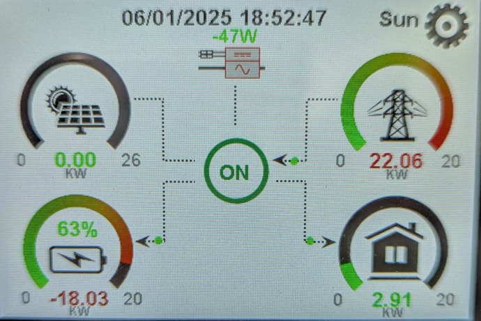 Auf habe dann auf Seite 2 der Battery Setting bei "Grid Charge" ebenfalls noch den Wert von 40 A auf 350 A hochgesetzt. Daraufhin lädt er jetzt wenigstens mit rund 5,8 kW, was immer noch nicht einmal 1/3 der möglichen Leistung ist.