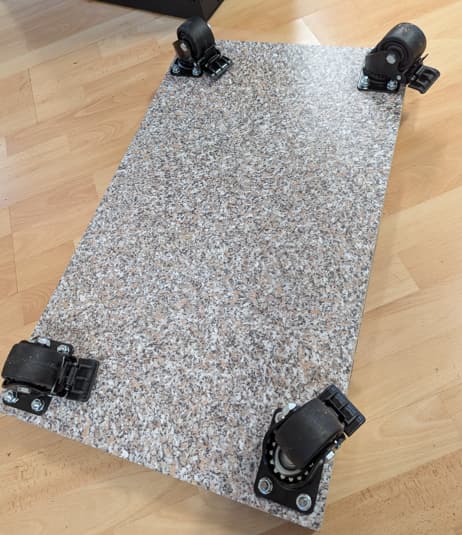 Das "Fahrgestell" besteht aus einer 4 cm starken Küchenplatte mit einer 2 cm starken Hartholzplatte darüber. Die Hartholzplatte hatte ich eigentlich auch nur noch zusätzlich über die Küchenplatte gesetzt, damit die Unterlegscheiben für die Verschraubung der Rollen ein ordentliches Widerlager haben. Ich denke, von der Traglast her sollte eigentlich auch die Küchenplatte allein schon reichen, da das Gewicht der Batterieboxen ja flächig wirken dürfte...