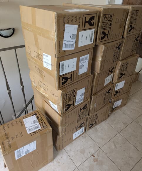 Habe die Boxen gerade ausgepackt und äußerlich auf Schäden untersucht. Sieht erst mal soweit ganz gut aus. 4 Stück übereinander sind auch echt imposant...