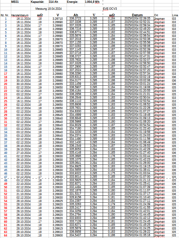 Ich denke, mit dem Ergebnis kann ich jetzt recht gut leben. Interessant war, dass die besten Zellen alle das Produktionsdatum 16.11.2024 haben und aus der Produktionslinie G3 stammen. Da das die einzigen Zelle aus der G3 in meiner Lieferung waren, weiß ich leider nicht, ob das Team dort am 16.11.2024 einfach nur einen guten Tag erwischt hatte oder die G3 generell etwas bessere Produkte liefert als die anderen Linien.
