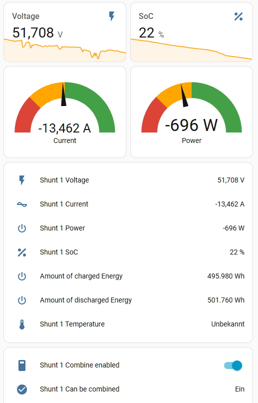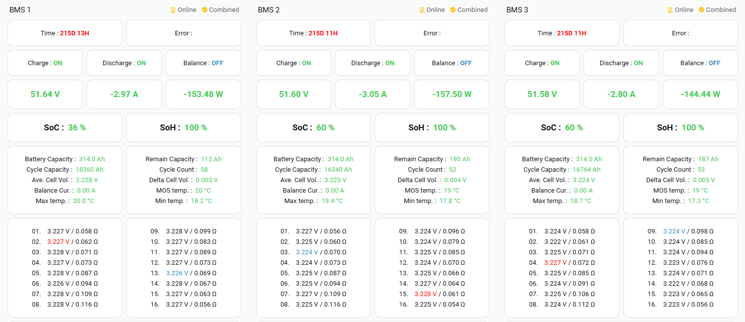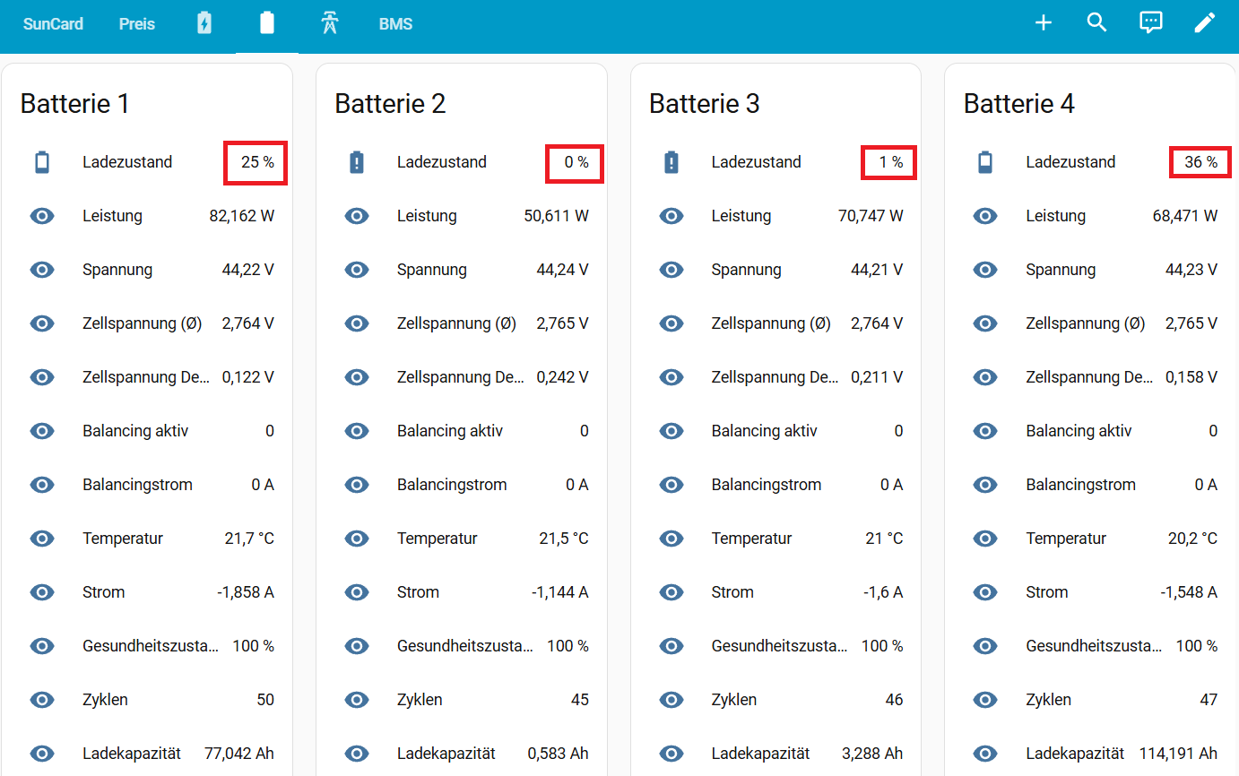 Die Ermittlung des SOC durch das JK-BMS ist ein Witz. Mit solchen Werten kann man keine Automation betreiben. Die Batterien 2 und 3 zeigten heute Morgen noch Werte um die 50% bevor sie plötzlich auf einstellige Werte abfielen.