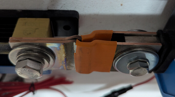 Zunächst habe ich wie angekündigt den Victron Smart Shunt zusätzlich noch verbaut. Zur Verbindung habe ich auf beiden Seiten flexible Busbars verwendet, die ich noch vom Bau der Batterien übrig hatte, da sowohl der Lieferant der Batterien als auch der Hersteller des Gehäuses flexible Busbars mitgeliefert hatten. Die verwendeten großen Busbars entsprechen jeweils einen Kabelquerschnitt von 50 mm².