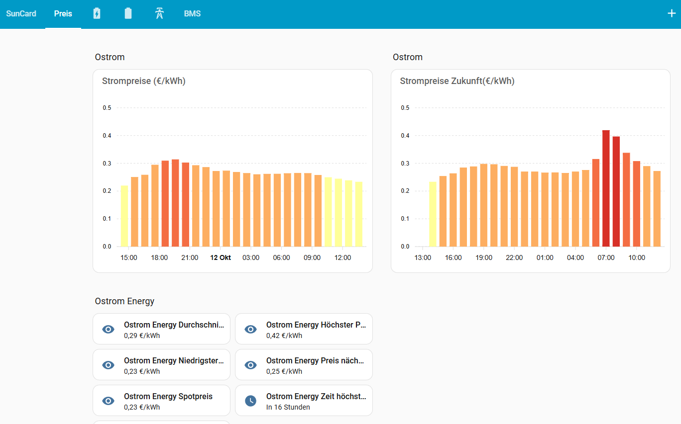 Die aktuellen Preise von Ostrom bekomme ich über eine entsprechende Integration jeden Tag nach 14.00 Uhr für den nächsten Tag auch in HA angezeigt. Hier kommt sicherlich demnächst (hoffentlich) noch eine Aktualisierung auf die inzwischen vierteilstündlichen Preise.