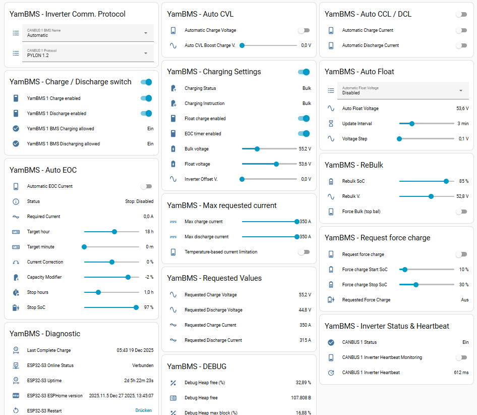 Die Batterien kommunizieren per RS485 mit YamBMS. Die Kommunikation zum Deye erfolgt per CAN ebenfalls vom YamBMS aus und nicht mehr direkt vom JK-BMS-Master.