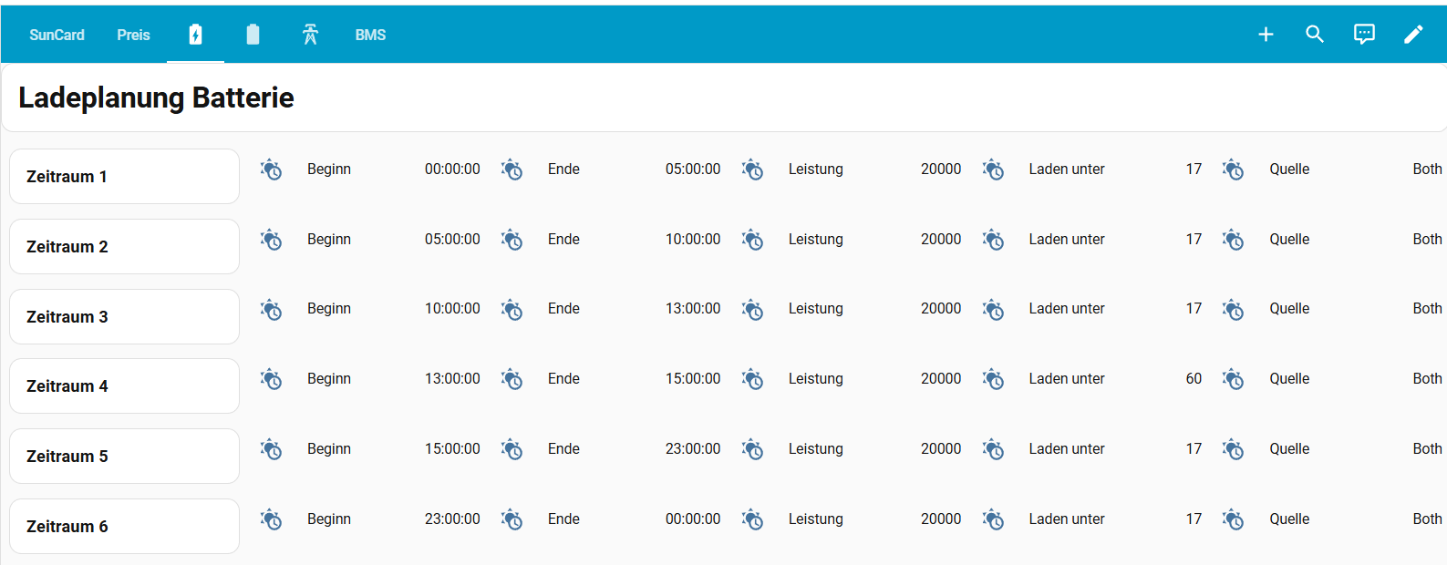 Für die manuelle Ladesteuerung via HA habe ich mir einfach die Einstellmöglichkeiten am Display des Deye in einer weiteren Ansicht in HA nachgebaut. So kann ich das bequem aus der Ferne machen, selbst wenn ich mal mehrere Tage unterwegs bin.