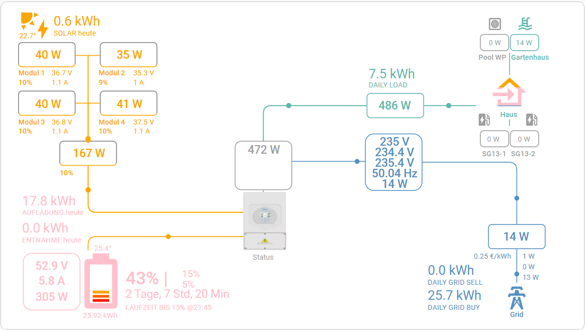Meine Übergangslösung zur Visualisierung in Home Assistant läuft inzwischen. Dazu habe ich die Sunsynk Power Flow Card etwas angepasst. Die Dartstellung ist zwar nicht optimal, da ja die PV nicht am großen Deye angeschlossen ist, sondern AC-seitig ans Hausnetz gekoppelt ist, aber für meinen Bedarf reicht es so erst einmal völlig.