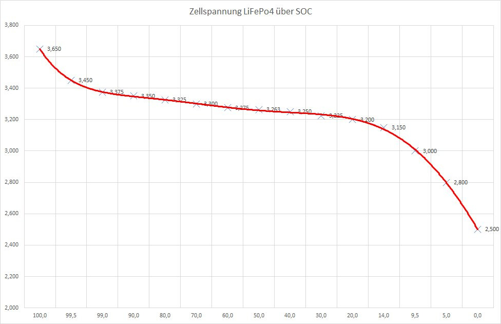 Ich meine diese Tabelle, wo 3V bei SOC 9,5 dargestellt sind. Und wenn ich bei Goolge nach "lifepo4 zellspannung tabelle soc" suche, erhalte ich in den meisten Links Ergebnisse, die das bestätigen. Woran liegt das, denn offensichtlich stimmt es nicht? Wo kommen die 9,5 bzw. 10 % bzw. SOC her? Wie lässt es sich plausibel erklären?