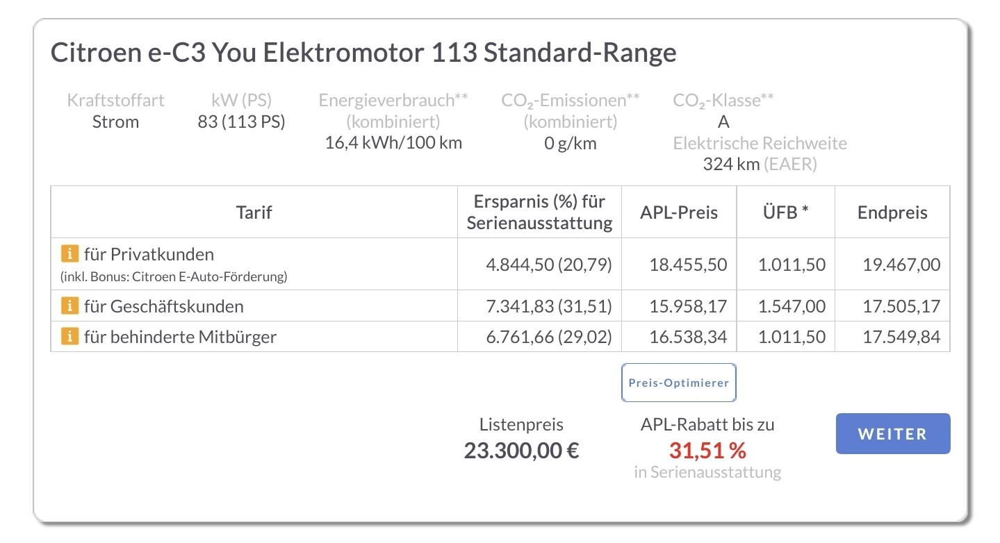Da geht die Reise los, günstigster 5Sitzer Krass auffällig wie sie sich die Taschen vollstecken mit der angeblichen Citroën Prämie, Geschäftskunden bekommen das Auto billiger, ganz ohne Förderung. Oder ist das nur die MwSt.? Warum ist der Endpreis vor Förderung höher als bei den anderen?
