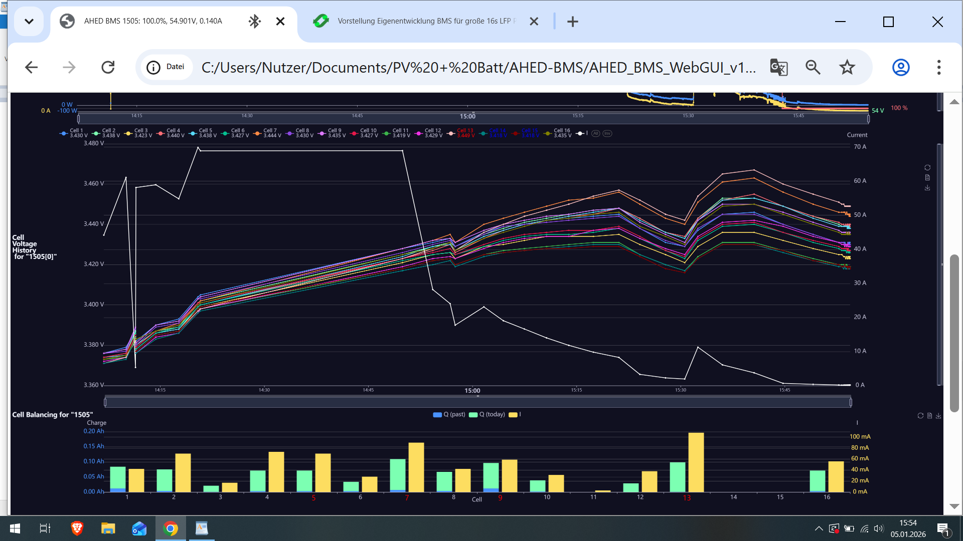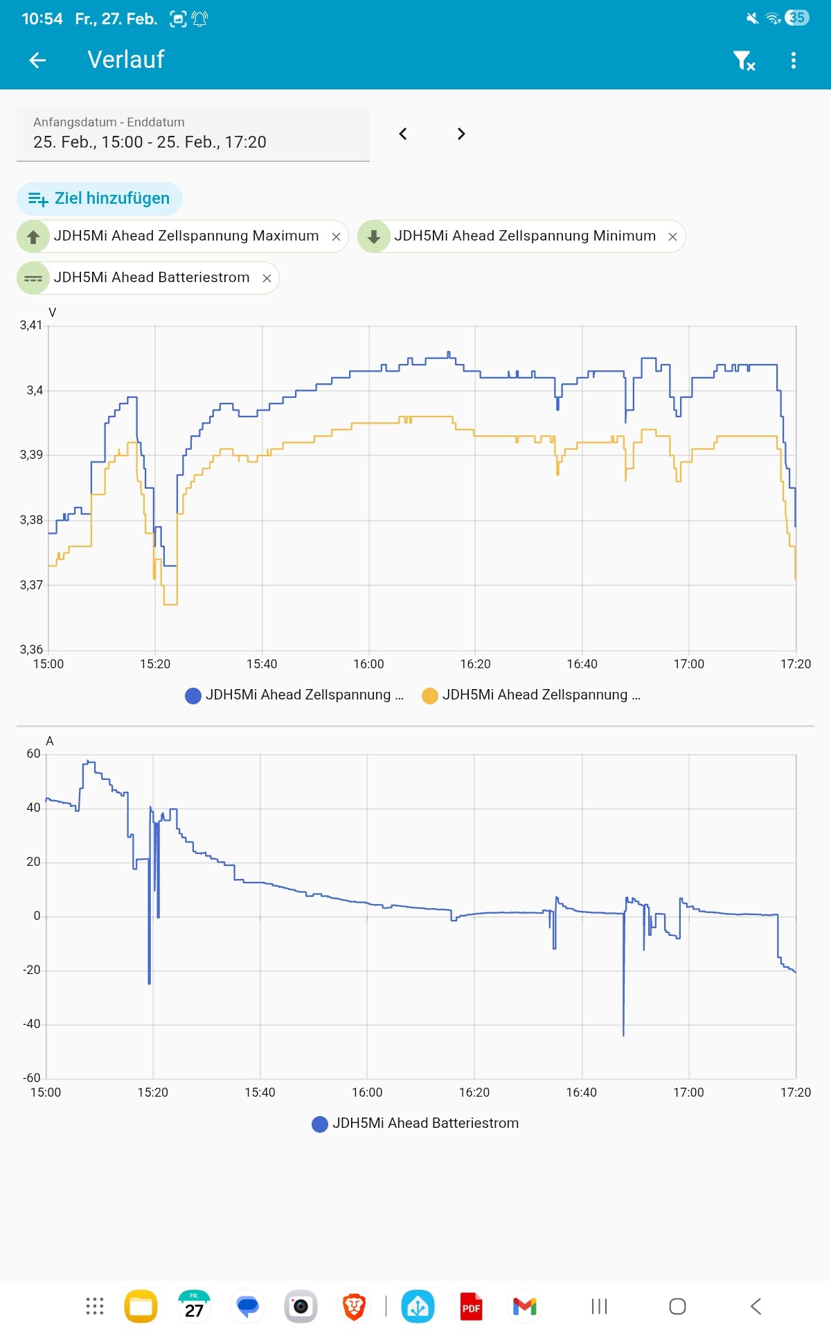 Gebalanced wurde seit Anfang Januar nicht mehr. So im nachhinein denke ich, wäre eine untere Kalibrierung des AHED-BMS bei 3,00 Volt eigentlich gut gewesen, aber ich war an dem Abend über die niedrige Spannung zu überrascht und habe dann auch etwas aus dem Netz nachgeladen.