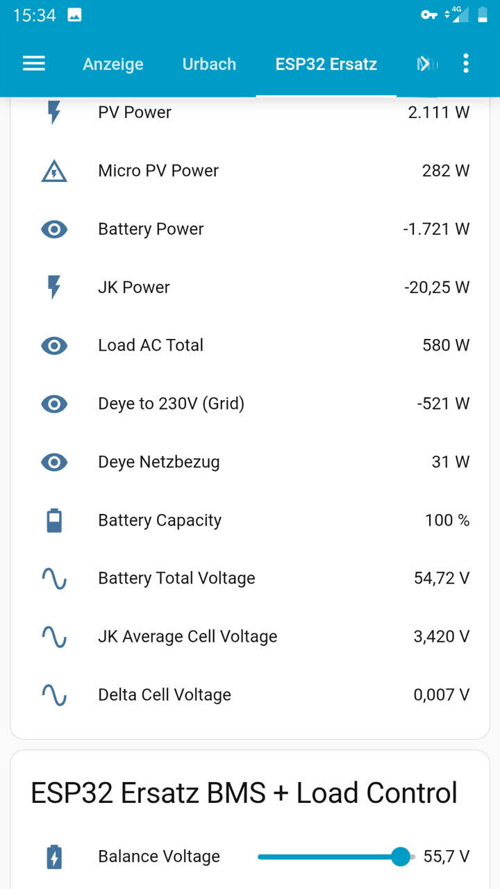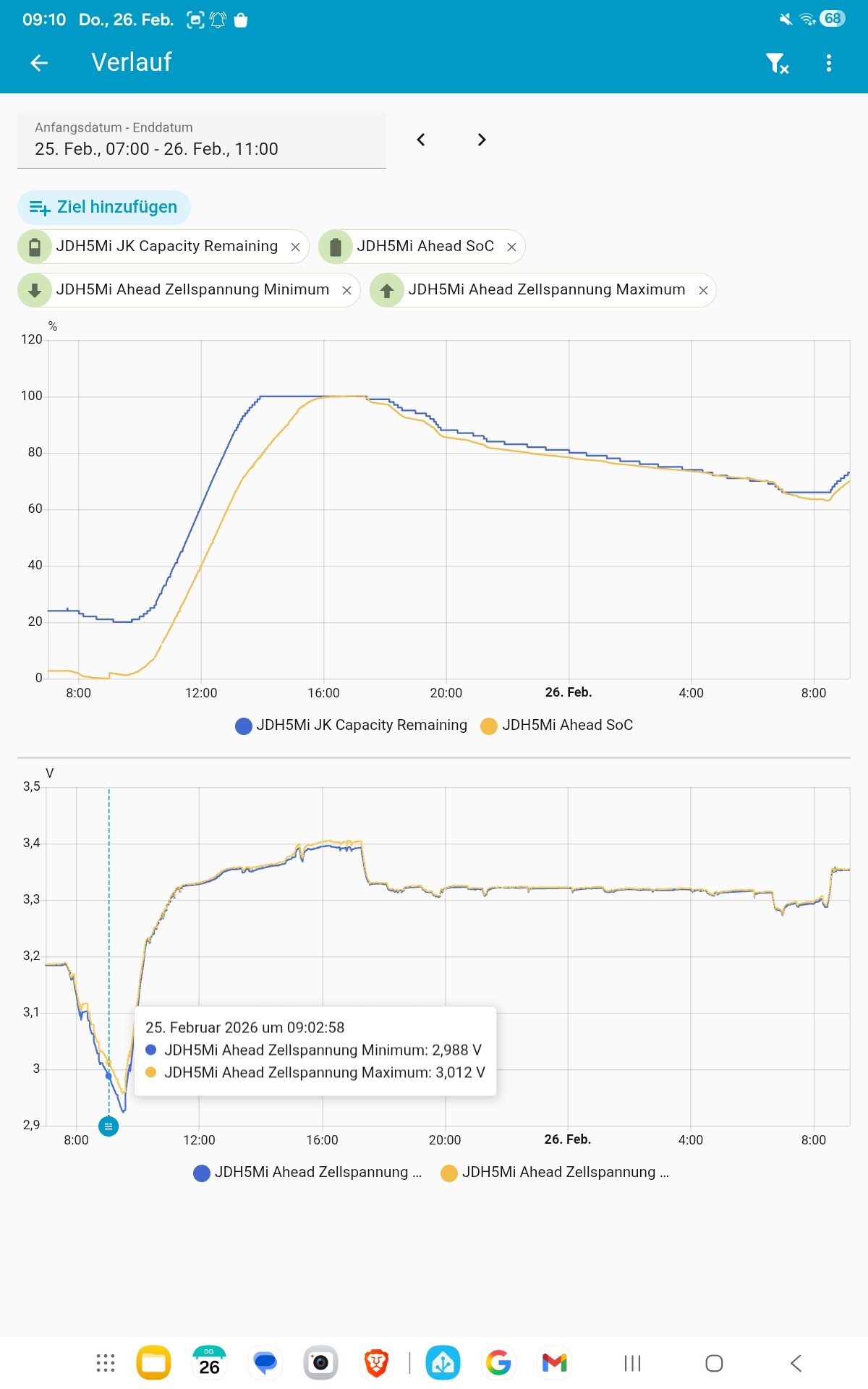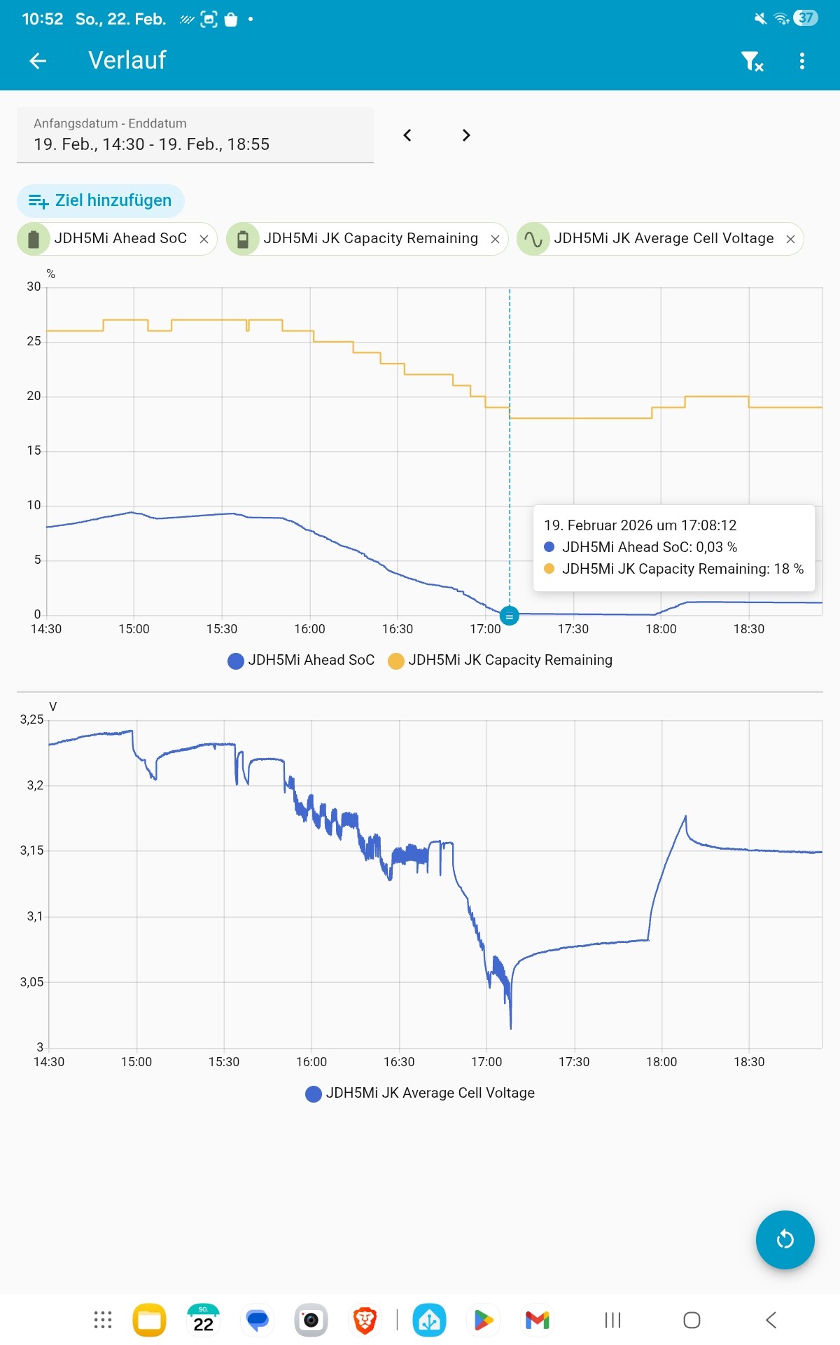 Eigentlich wollte ich nicht so tief entladen. Die Steuerung erfolgt noch über den SoC des JK-BMS. Für das Einbeziehen der Werte des AHED-BMS in Home Assistant habe ich die Steuerungsplatine erneuert und dabei den Wert für das Beenden des Entladens nicht angepasst.