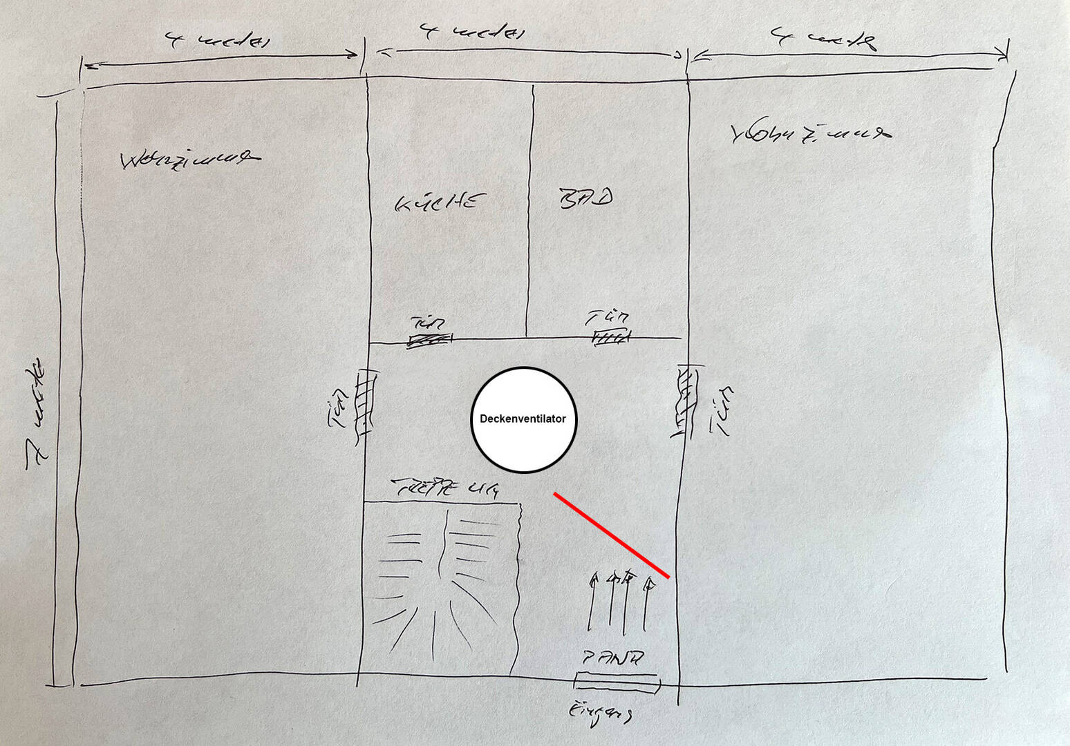 Dadurch dass das Innengerät nicht mittig hängt wird das Rechte Wohnzimmer auch immer genau 1° wärmer als das rechte. Ich will versuchen das durch eine 50cam hohe an die Decke gehängte Plexiglasplatte auszugleichen, welche die Warmluft der Panasonic direkt zum Deckenventilator leitet (In der Skizze rot eingezeichnet)