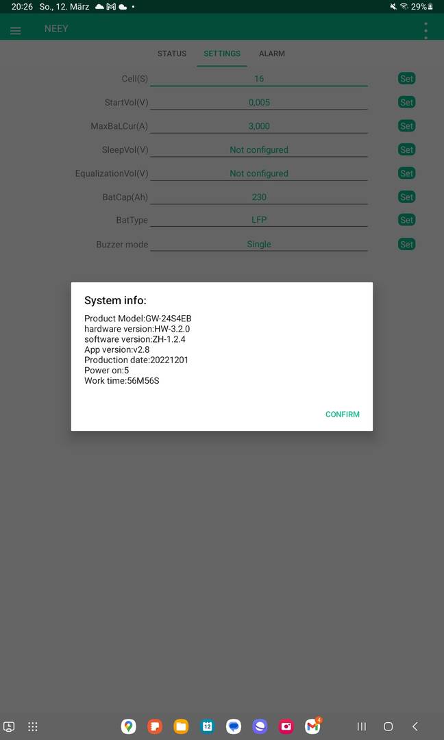 ich bekomme auch die Krise... Heute zu meinem Seplos noch ein Neey V4 installiert, App geladen, App mit Neey verbunden, soweit so gut. 16 Zellen und LFP eingestellt. Die Gesammtspannung sowie die Zellenspannungen stimmen