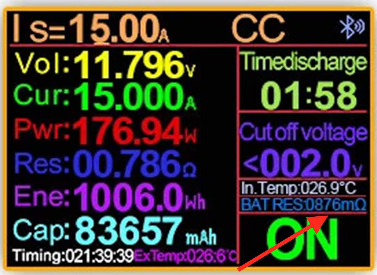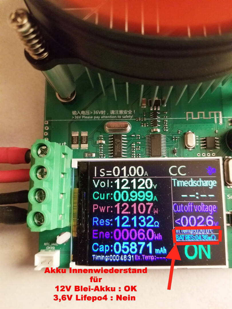 Ich habe dieses Gerät hauptsächlich gekauft, weil es ein Variabler Lastwiderstand ist, aber es sollte auch den INNENWIDERSTAND DER BATTERIE messen.
