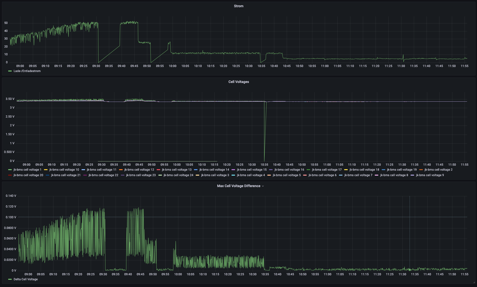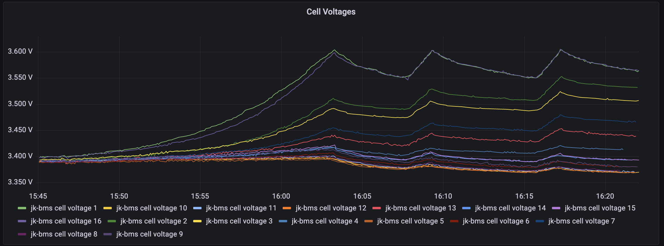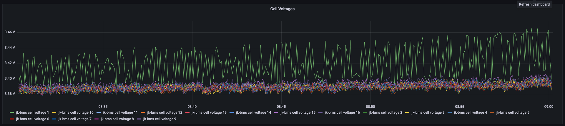mein 16s System mit JK BMS ist seit einer Woche in Betrieb und jetzt habe ich noch via esphome-jk-bms die Zellspannungen in Grafana. Was mir auffällt, ist, dass Zelle 1 immer von allen anderen Zellen abweicht - sowohl nach oben, als auch nach unten. Woran kann das denn, außer an der Zelle selbst, noch liegen? Balancer Kabel? Schlechte Verbindung der Busbar zur Zelle? Oder muss es eigentlich die Zelle selber sein?