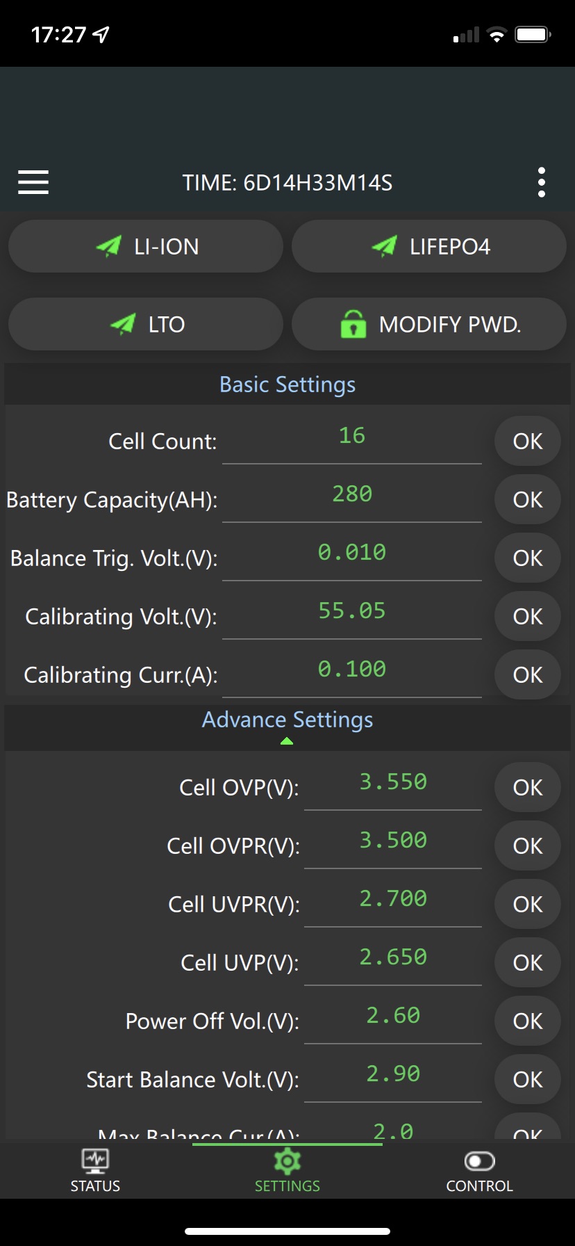und die letzten zwei Tage,BALANCING OFF letztes aktives Balancing ca 2 Wochen manuell gestartet und beendet, weil sich die Spannung auf minimal 3.2V setzen lässt