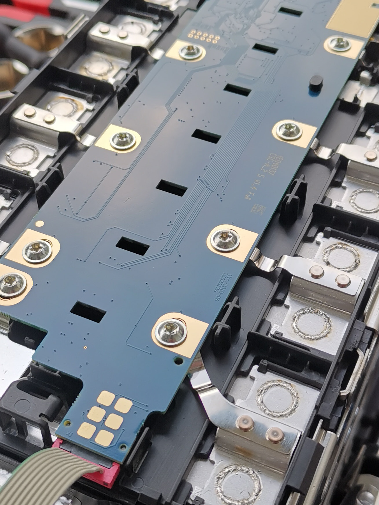 Bedeutet, alles was den Zellenausgleich betrifft muss innerhalb dieser blauen PCB passieren. Von außen kommt vermutlich nur die Ladespannung.