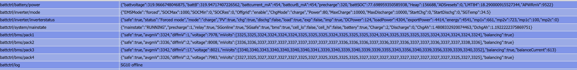 Ist eine 96S/320Ah 4x24S Batterie an einem SH10RT, BMS ist Eigenbau basierend auf ESP32, ADS131bq26-q1 und vier JK-BMS 0,6A Balancer Boards über Modbus-RTU.