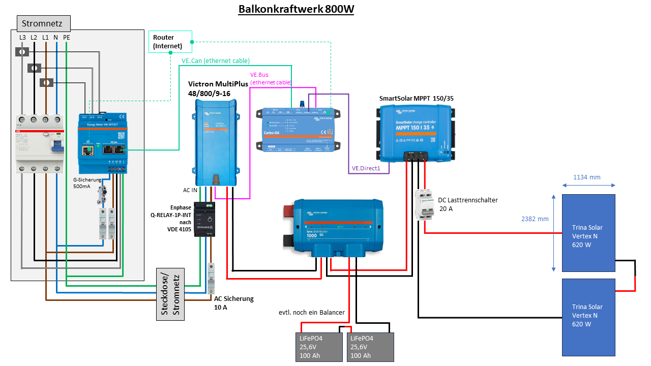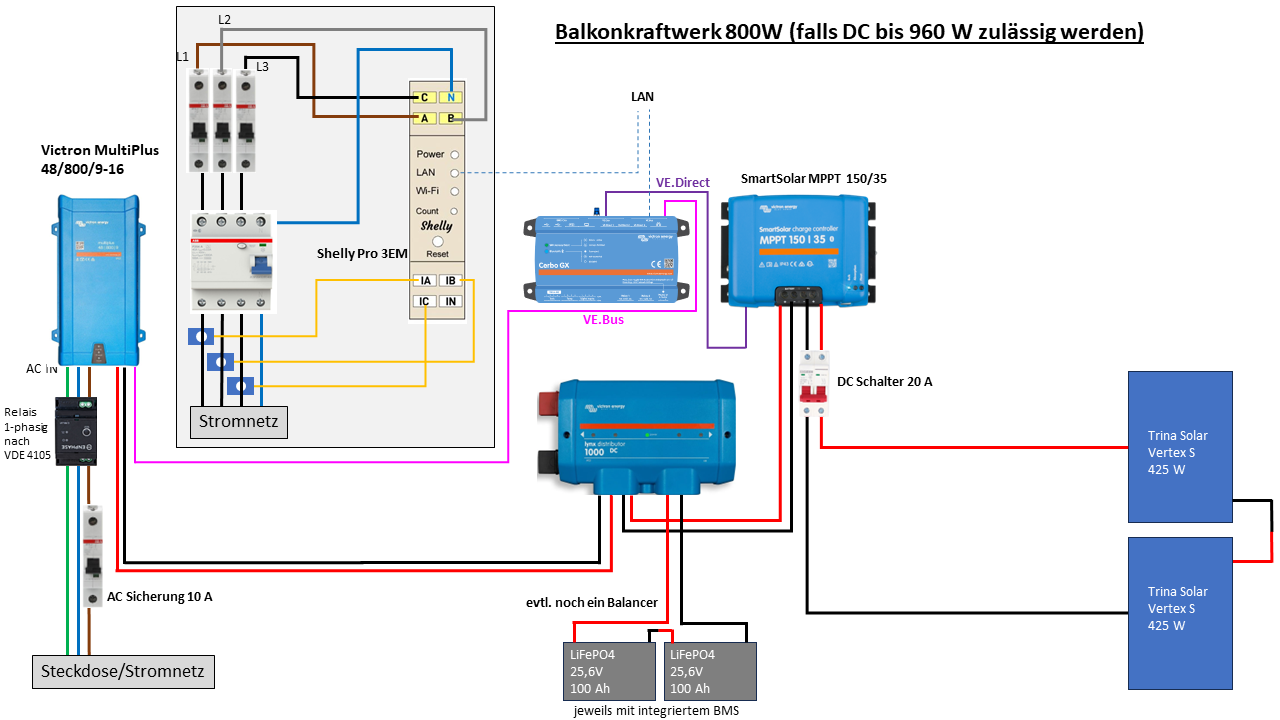 4. ich bin mir nicht sicher, ob die mini Multiplus (800) das so wirklich mit dem Cerbo unterstützen. Also ob die als netzgekoppeltes ESS betrieben werden können. ich dachte die wären nur für den WoMo betrieb gedacht.