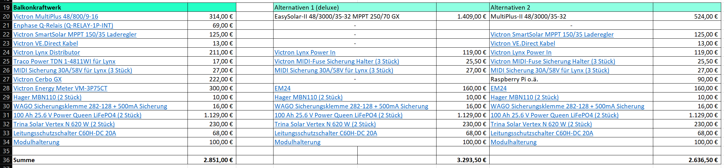 Wenn ich MultiPlus & Co weglasse und auf den Hoymiles + OpenDTU + Shelly setze, sollte ich auf ca. 2.000 € kommen.