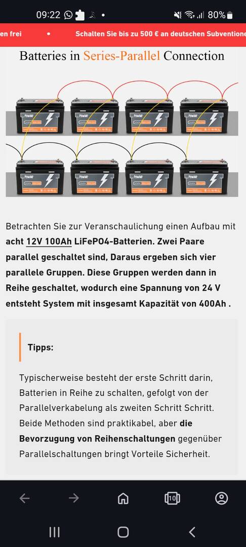 Also, ich habe von PowMr die unten im Bild sichtbare Verschaltung von 8 Batterien, sowohl in Serie, als auch paralleler gefunden.