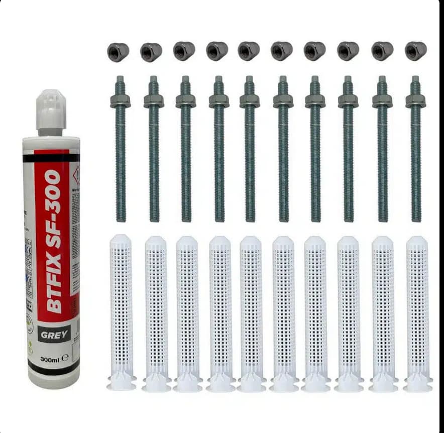Wenn es wirklich halten soll für schwere Lasten dann ist Injektionsmörtel zusammen mit Siebhülsen die richtige Wahl. Das Bild unten ist ein Beispiel und nicht als Empfehlung zu verstehen.