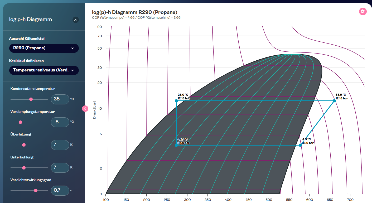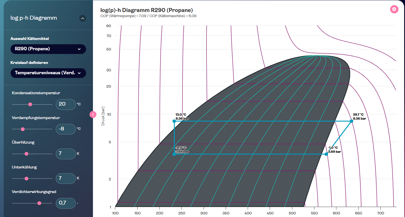 Verglichen werden eine Raumtemperatur von 20 °C und eine von 8 °C bei jeweils −5 °C Außentemperatur. Die eingesetzten Verdampfer- bzw. Kondensationstemperaturen sind grobe Abschätzungen auf Basis meiner eigenen Anlage.