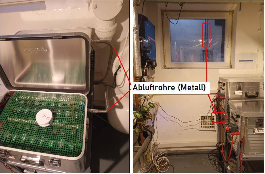 3. Da zwar LFP-Akkus nicht brennen aber gefährlich ausgasen können (explosive Atmosphäre), soll ein Edelstahlwellenrohr den Gas-Überdruck aus der AkkuAluBox ins Freie leiten. Der Gasaustritt in den Kellerraum sollte daher gering sein.
