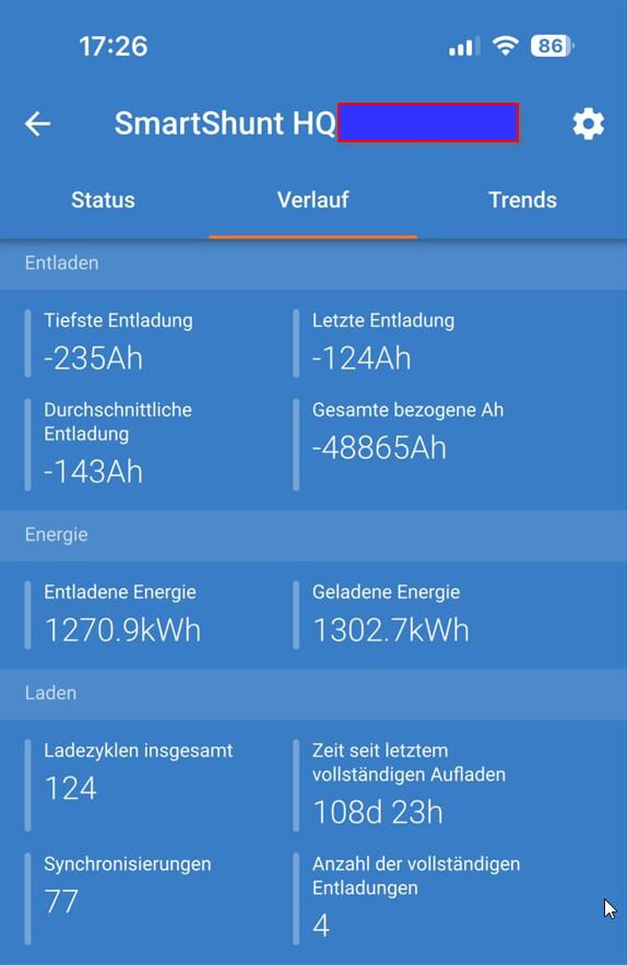 aus meiner ersten Selbstbau PV-Anlage habe ich nun wegen Umbau zwei arbeitslose Power Queen 24V 100Ah LiFePO4 Akkus übrig. Die Akkus waren in einem 24V System mit Victron Laderegler verbaut und haben insgesamt 124 Ladezyklen hinter sich, siehe Screenshot vom Victron Smartshunt. Die Akkus sind zudem noch innerhalb der Herstellergarantie (5 Jahre), gekauft in 09/23 und 05/24 und funktionieren tadellos.