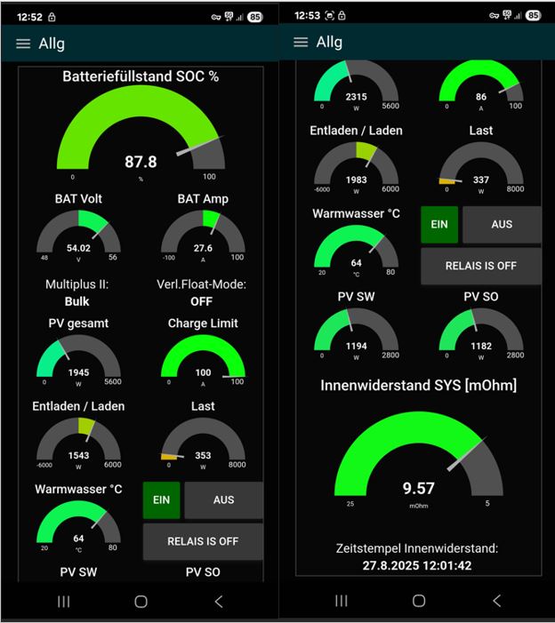 Dies hängt an einem Victron Multiplus + Cerbo, 2x MPPT 150/45 und 500A SmartShunt.