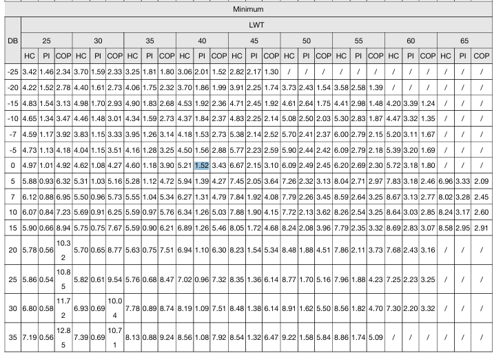 Normal Leistungsaufnahme bei 40 Grad VL und 0 Grad 2,37kw. Zumindest Theretisch könnte sie auf 1,07 runter gehen. Meine Anlage moduliert nicht besonders weit. (Bei 0 Grad und 42 Grad Vorlauf läuft sie aktuell mit 2 kW und Taktet.