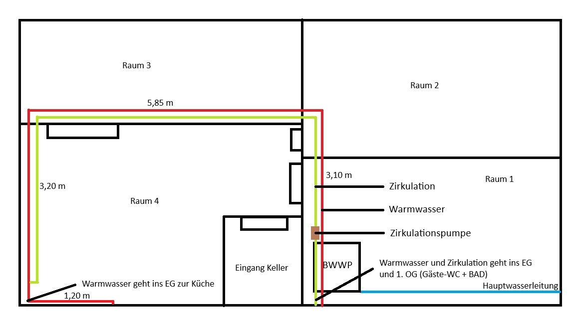 ich habe in meinem Keller eine Brauchwasserwärmepumpe (178L, Viessmann Vitocal 060-A) stehen. Die Wasserleitungen mit Zirkulationsleitung (inkl. Pumpe) verlaufen bei mir unterhalb der Decke und gehen dann in zwei unterschiedlichen Räumen nach oben ins EG zur Küche und ins EG/OG zum Gäste-WC/Bad.