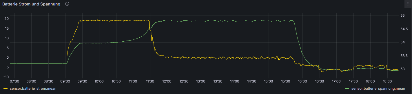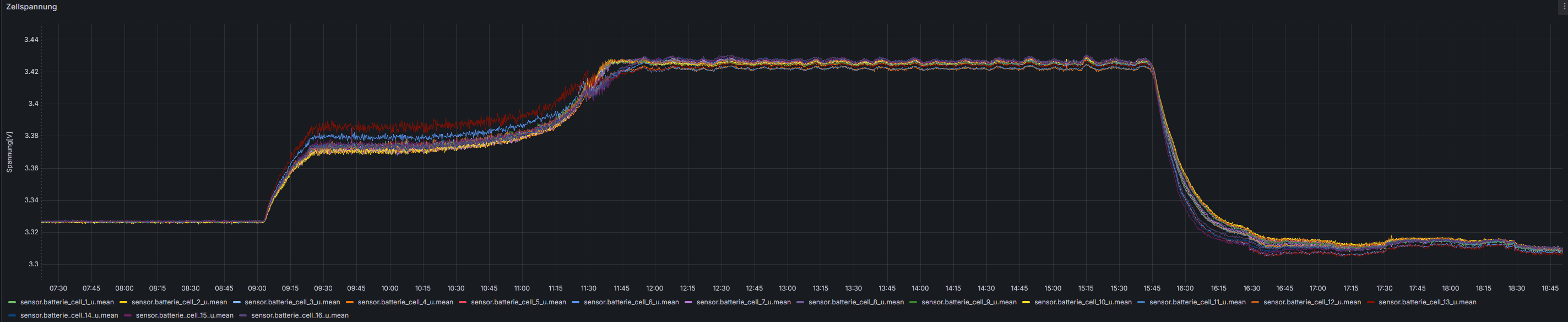 Die Spannungsdifferenzen des Ersten Diagramms deuten auf stromabhängige Spannungsanteile hin. Untersuche erst mal ob Kontaktprobleme der Zellenverbinder bestehen, indem du bei 15A Ladestrom unter den Zellenverbindern direkt an den Zellenpolen im mV-Bereich misst. Der Balancer scheint um 11:25 bei 3,41V bei noch hohem Strom aktiv zu werden. Man sieht es an dem von @carolus als “Quirl” bezeichnetes Gewirre. Die Zellen werden balanciert obwohl keine SOC-Differenz vorhanden ist. Ich würde die Startspannung auf 3,4V und die Zellendifferenz auf mindestens 20mV stellen