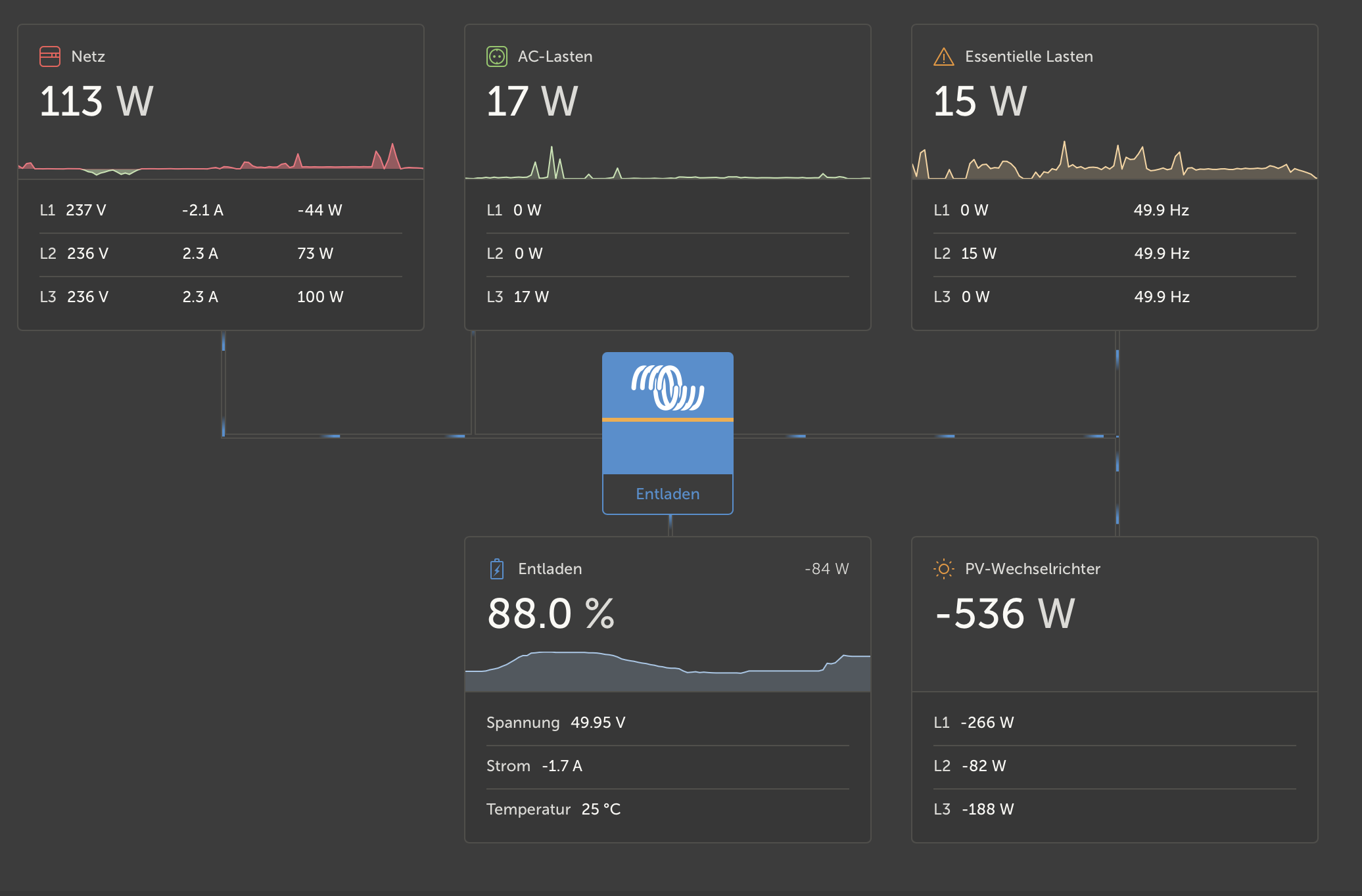 Ist dem so? Im VRM sehe ich (was ja eigentlich stromflusstechnisch richtig ist) einen negativen Wert vom Wechselrichter. Ich finde nur leider nirgends eine aussage dazu ob Victron hier einen positiven wert erwartet, wäre dem so, würd ich den Stromzähler einfach umdrehen.