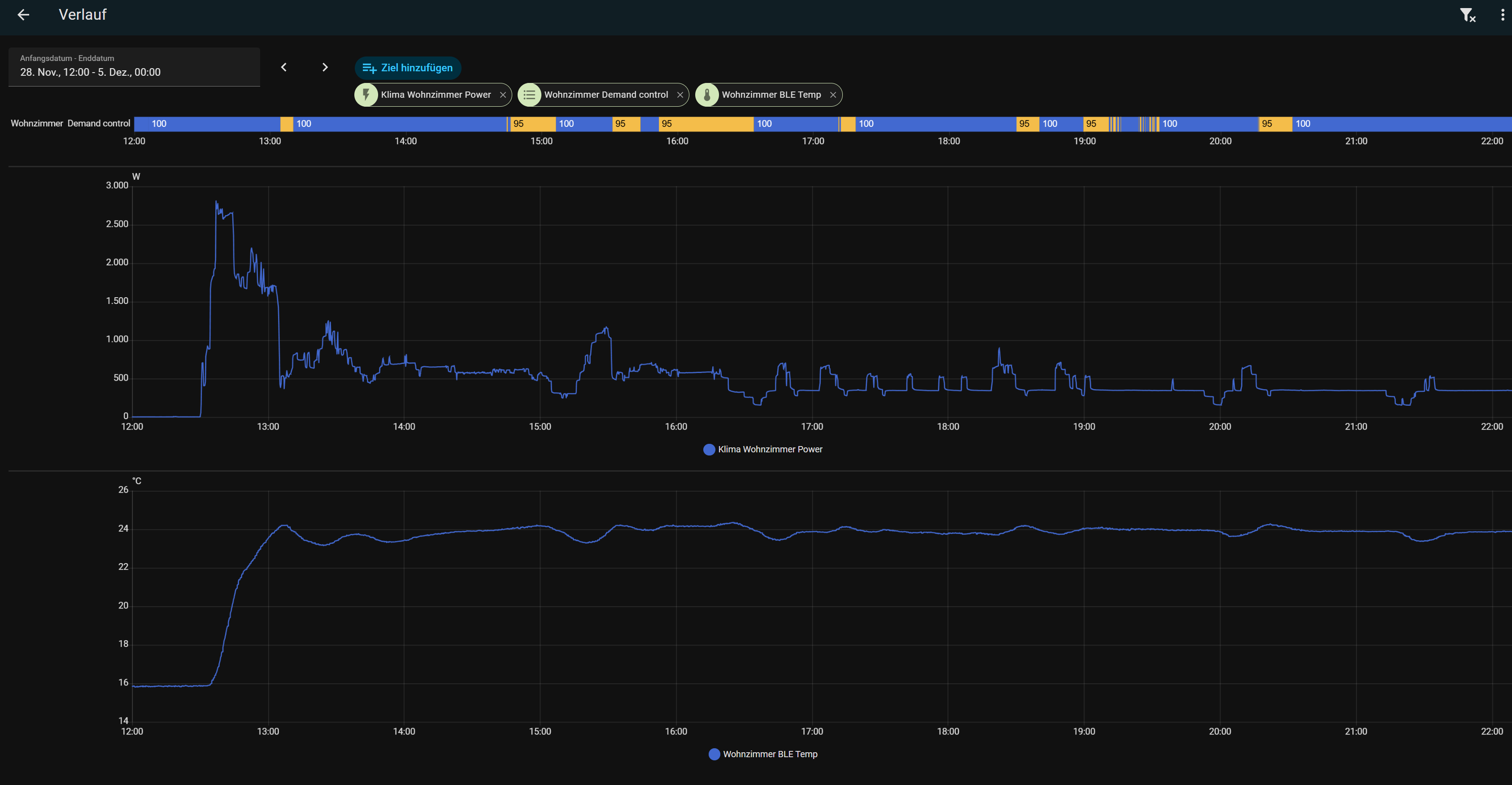 Lediglich die 95%-Demand scheinen nicht zu einem kurzzeitig deutlichen Unterschieden der Watt-Werte zu führen. Ich habe zu Beginn lange versucht mit 100%/95%/70%/40% die Zieltemperatur an einer alternativen Stelle im Raum konstant zu halten. Das funktioniert was die Temp-Werte angeht auch gut. Aber dieses Unterschießen und nicht smoothe Verhalten führt immer zu einem kurzzeitigen Flattern der Leistungsaufnahme. Dadurch ist mir das aufgefallen.