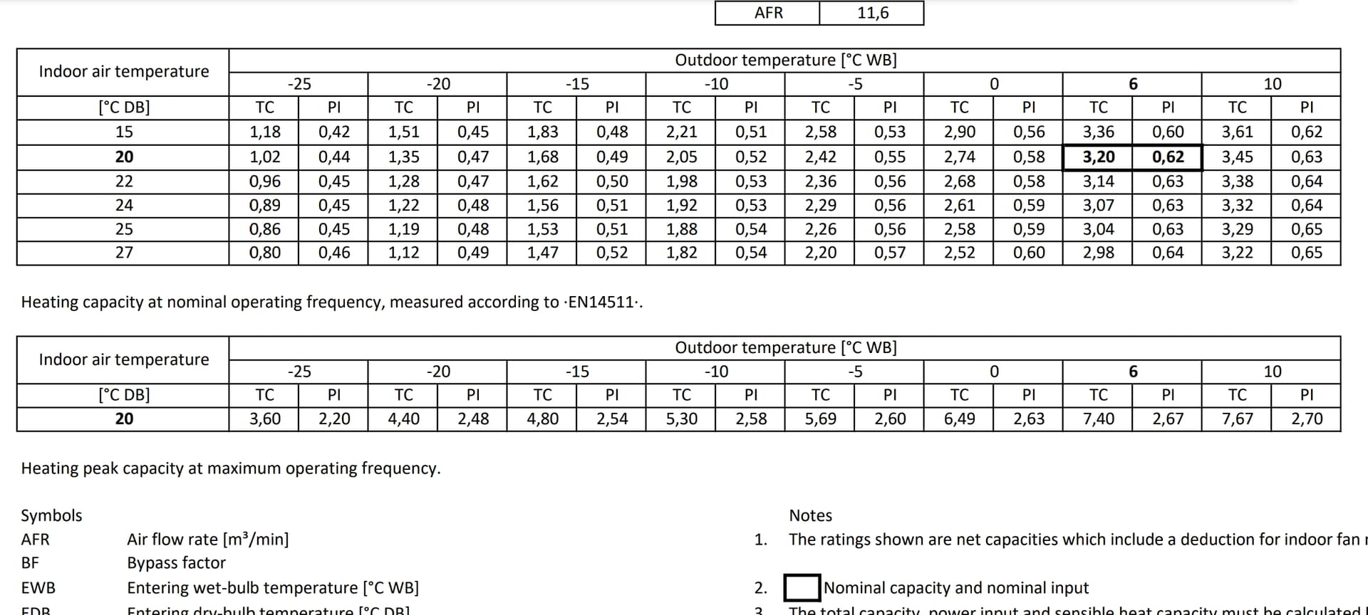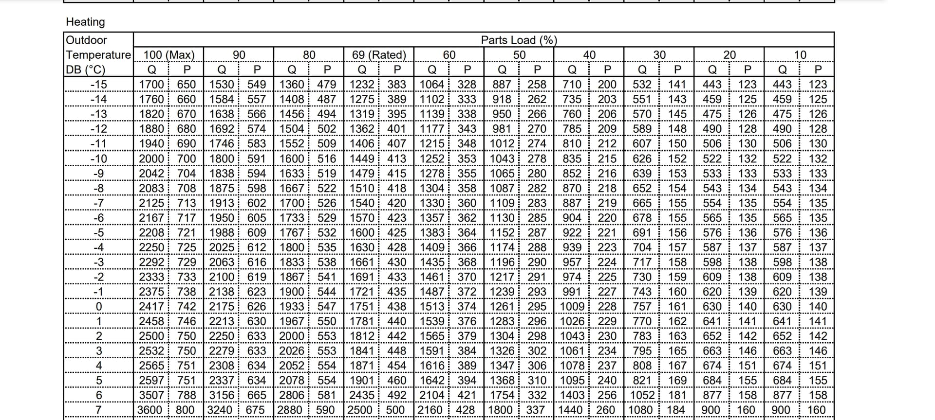 Das habe ich mit den Daten in der Daikin Tabelle verglichen. Die Heizleistung der Klimasplit kommt auch ungefähr hin.