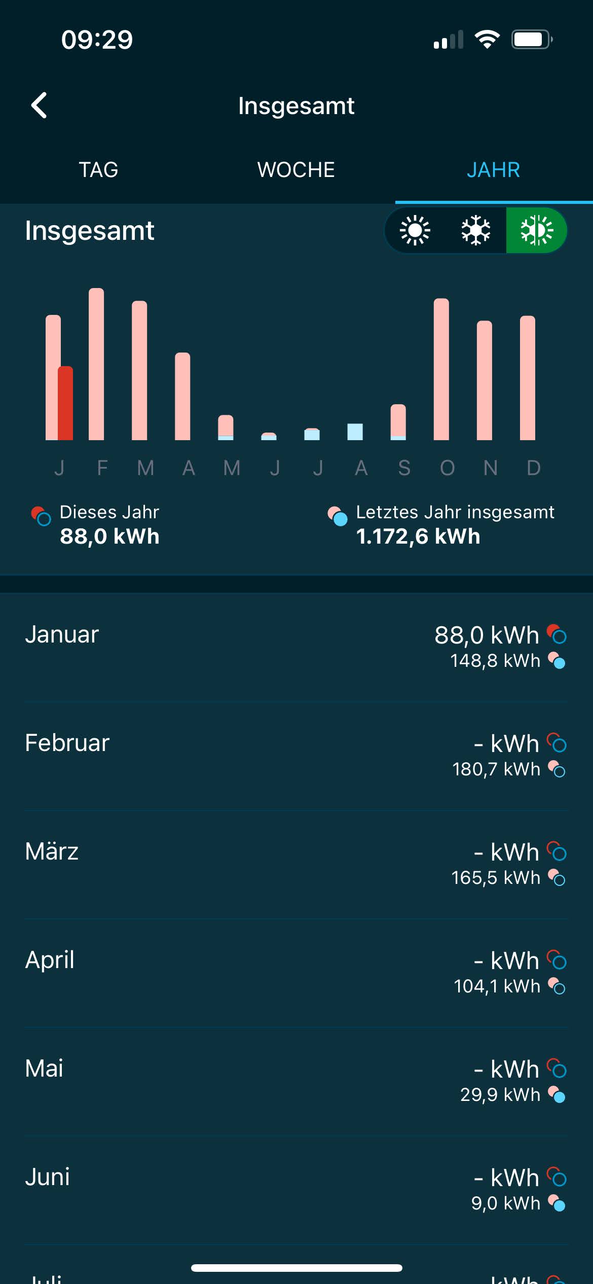 Der Stromverbrauch in dieser Heizsaison ist bei 1900kWh bisher. Ich rechne mit um die 3000-3500kWh für die ganze Saison. Wir kommen von ca. 1300-1500l Öl, was selbst ohne PV-Anteil im Strom ca. 30% Kostenersparnis sind.